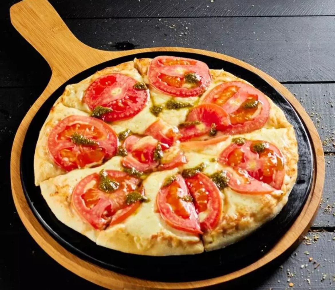 Ingredientes: queso mozzarella, tomates en rodajas, orégano y salsa de pesto tipo genovés.