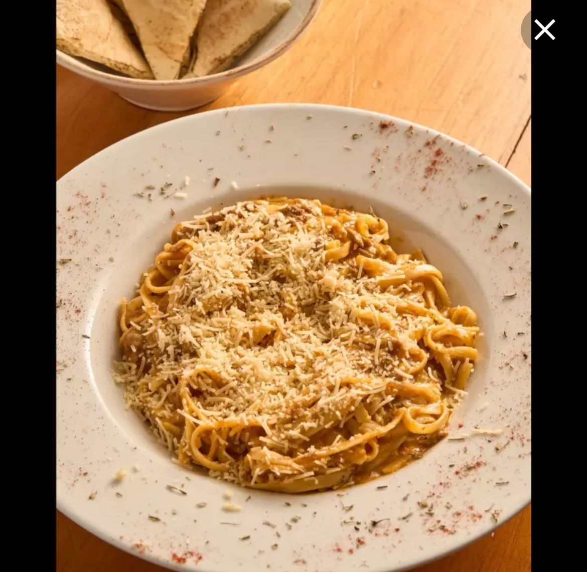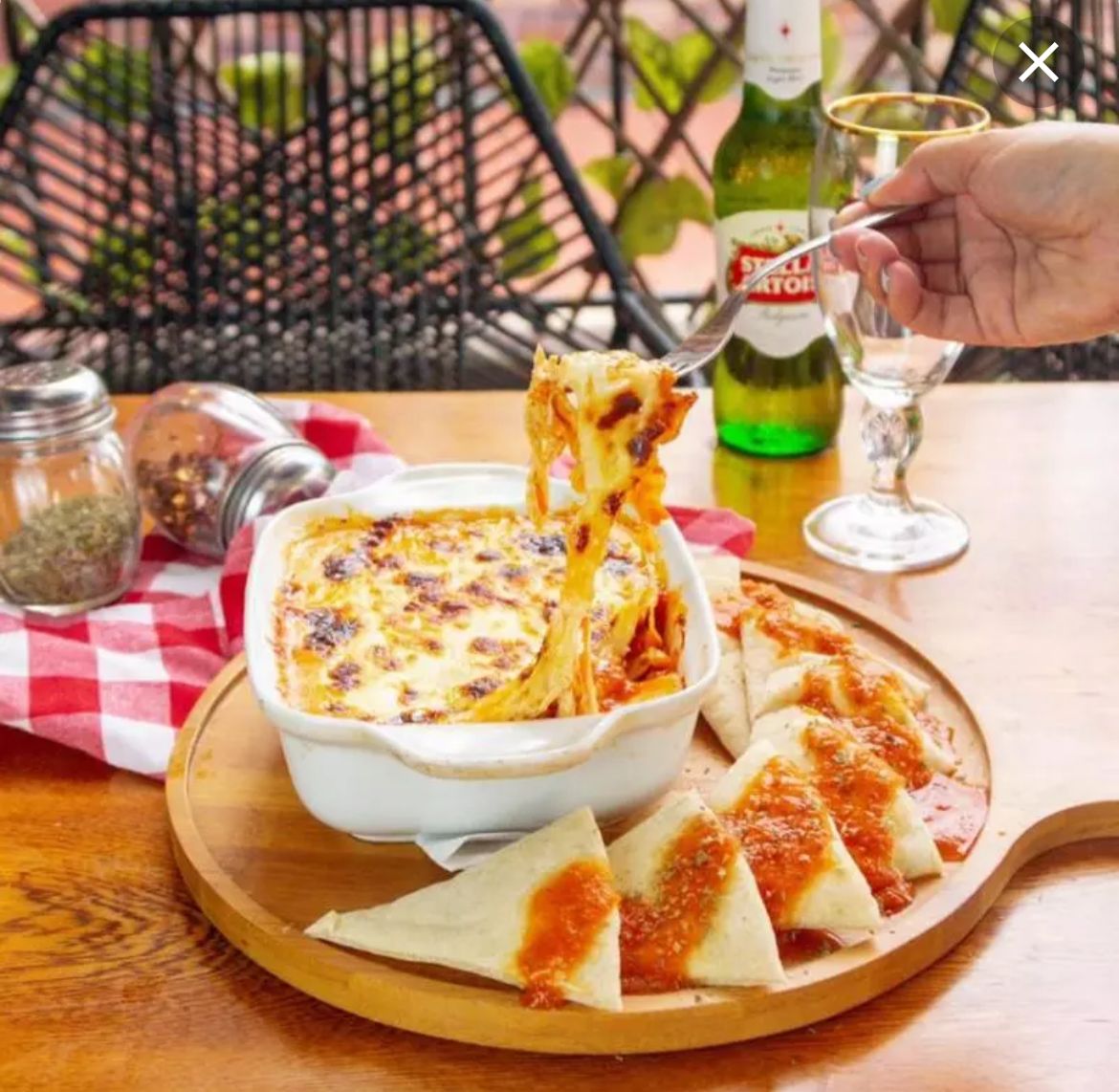 Lasagna mixta de pollo en hebras y carne bologñesa al horno de piedras con doble capa de queso mozzarella acompañado en pan tipo árabe.