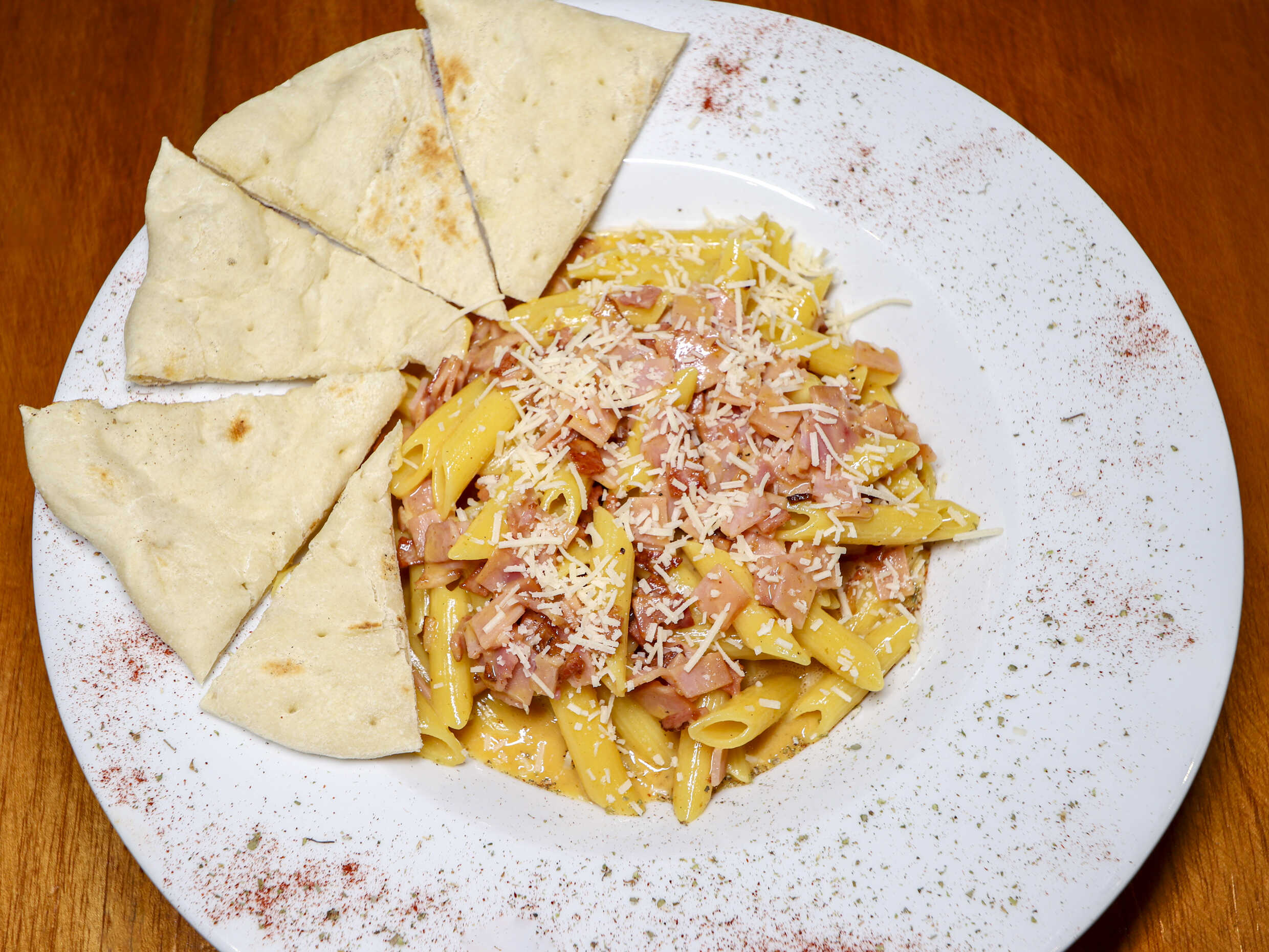 Nuestra pasta de 130 g tipo carbonara clásica con tocineta llega con un adicional de Jamón. Ideal para niños. Acompañada con nuestro pan blando.