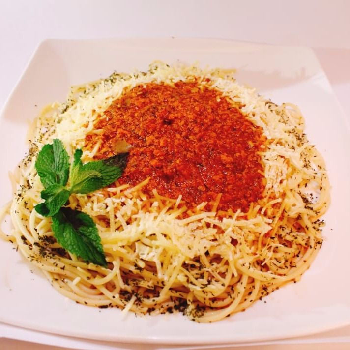 Espagueti en salsa boloñesa de carnisoya con queso parmesano.