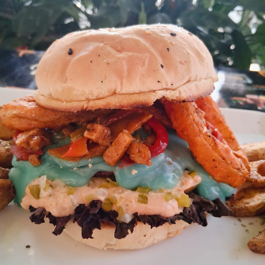 Pan de papa, proteína vegetal, queso azul vegano, aros de cebolla, salteado de jamón y pimientos bbq, lechuga rizada, tomate, salsa de la casa, acompañado de papas casco.