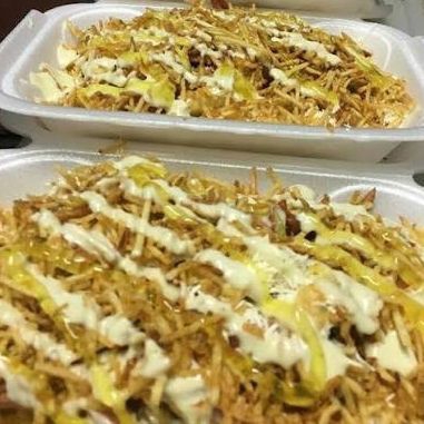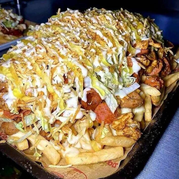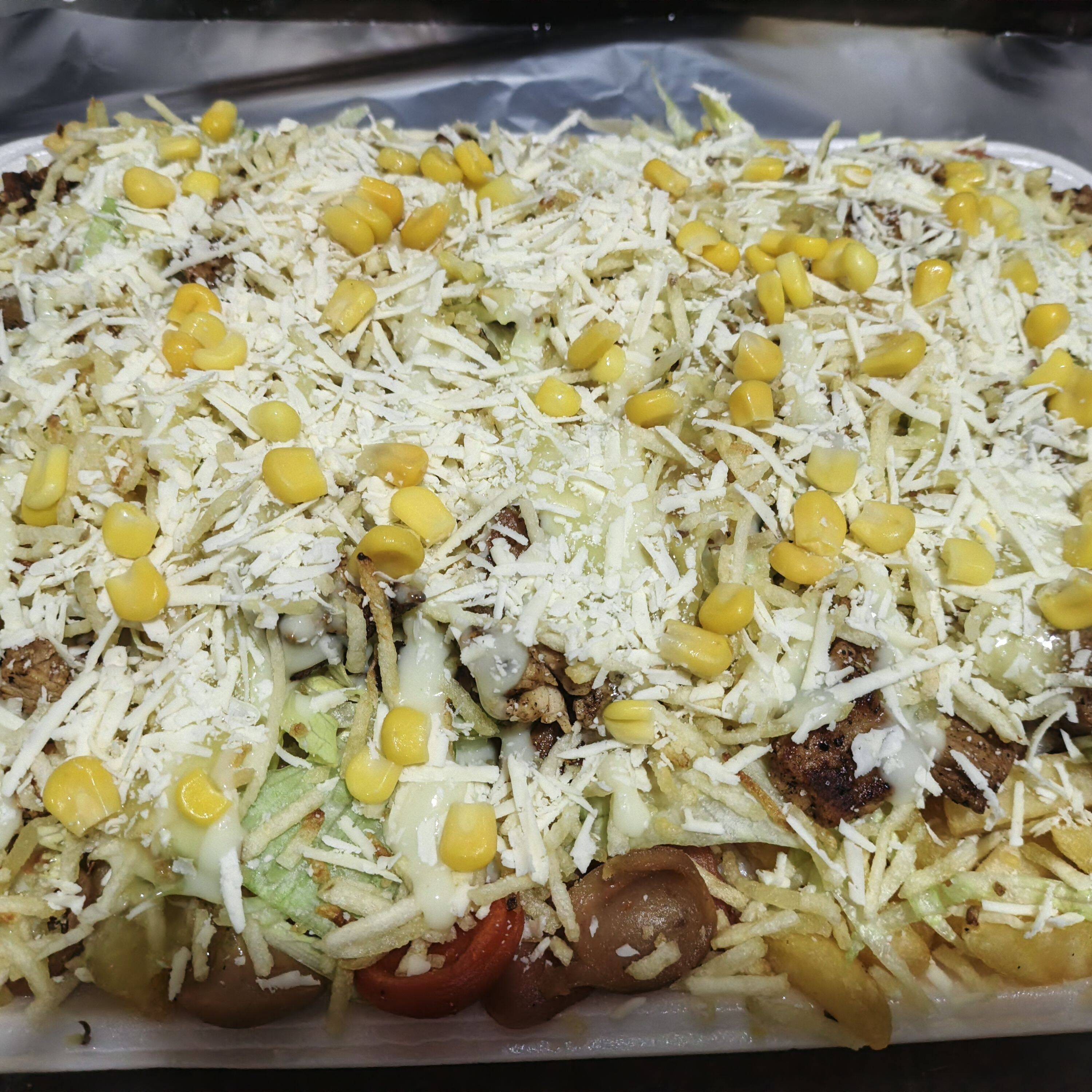 Papas francesas, salchichas, chorizo, butifarra, lechuga, chongo, queso, maíz, queso mozzarella gratinado