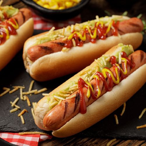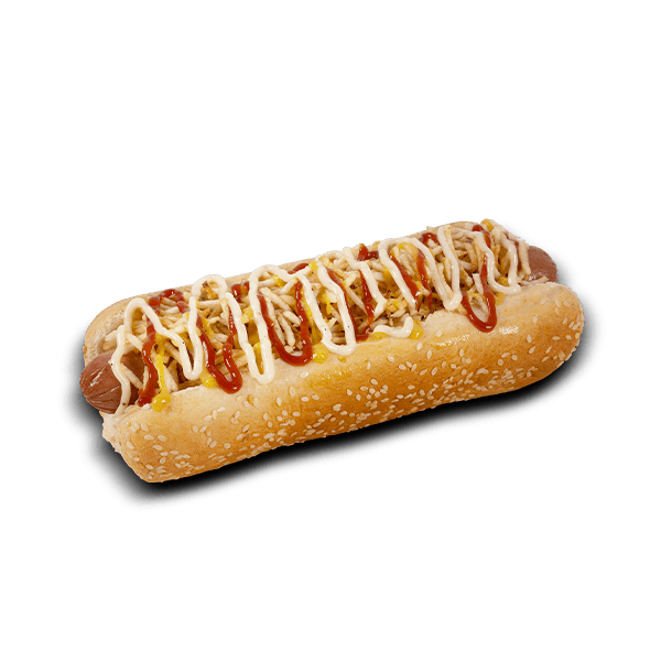Pan super, salchicha, lechuga, chongo, queso, salsas, tocineta, maíz, gratinado