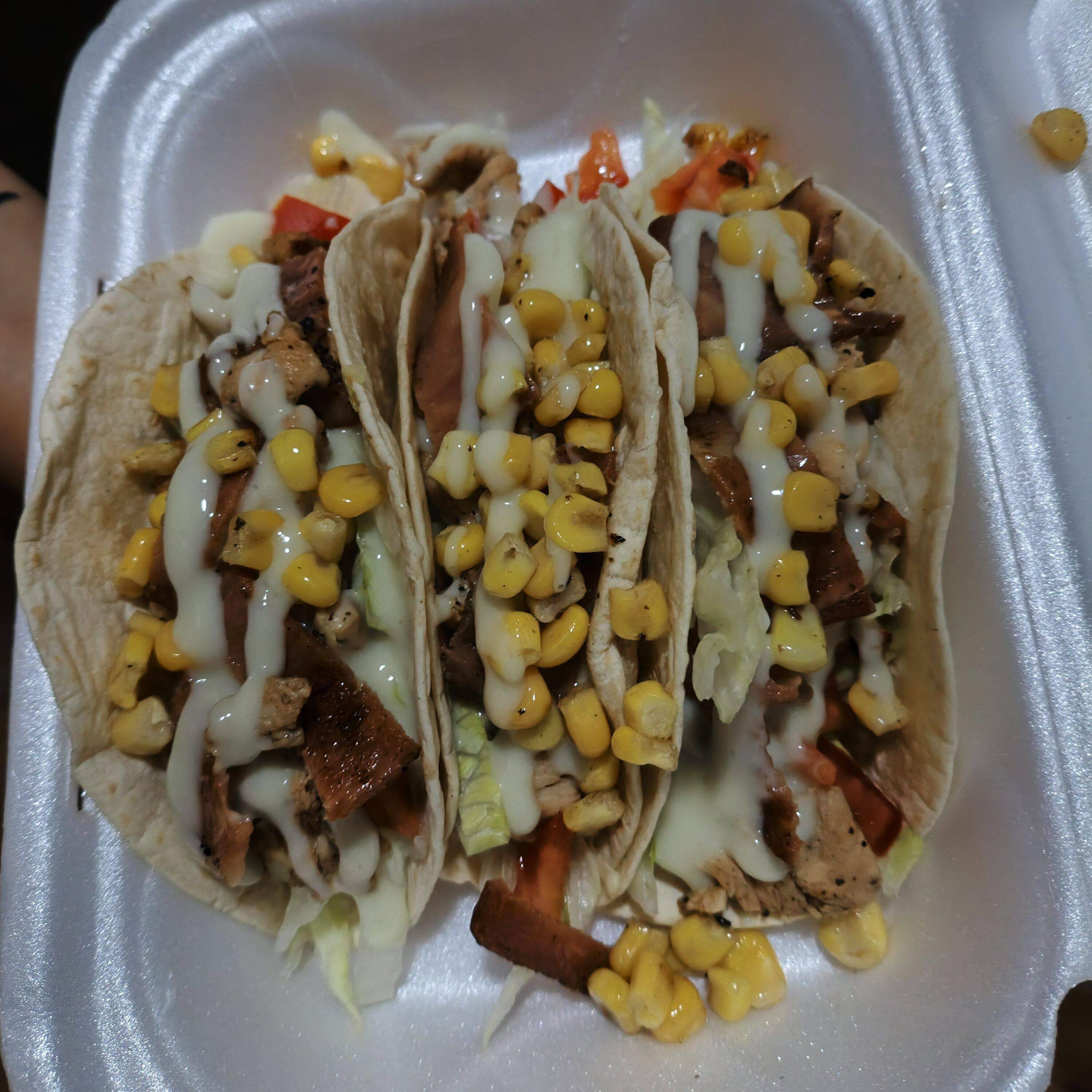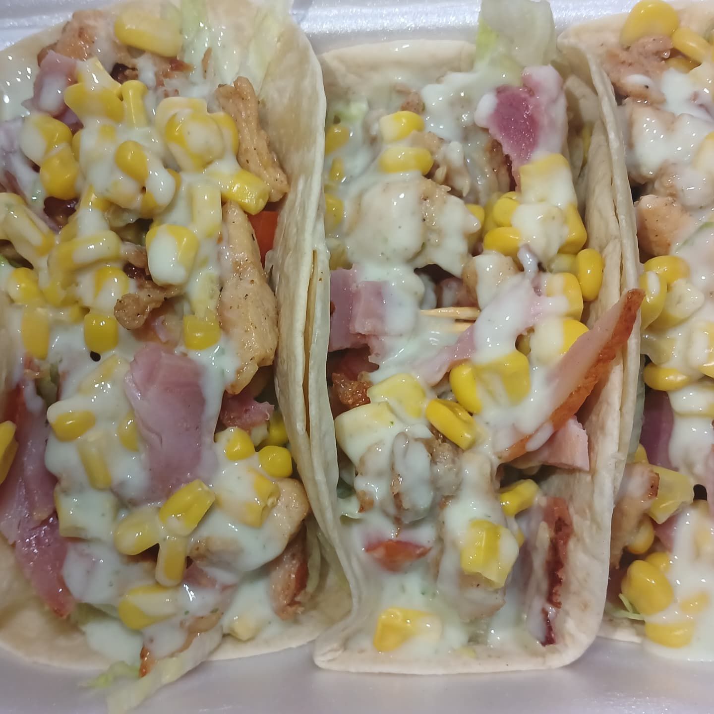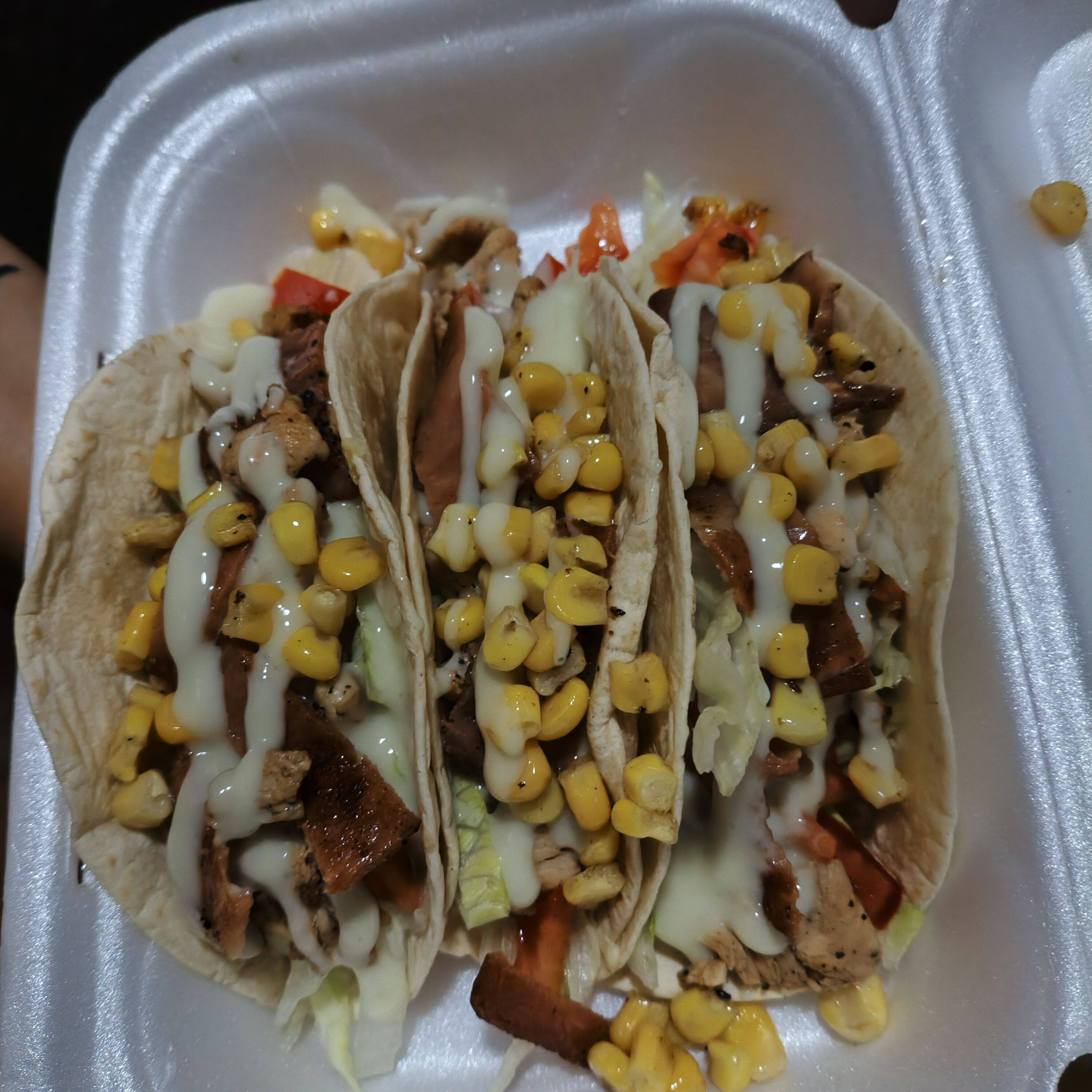 Tortillas, carne o pollo, tomate, lechuga, tocineta, maíz, salsa especial de la casa