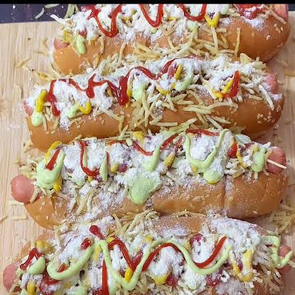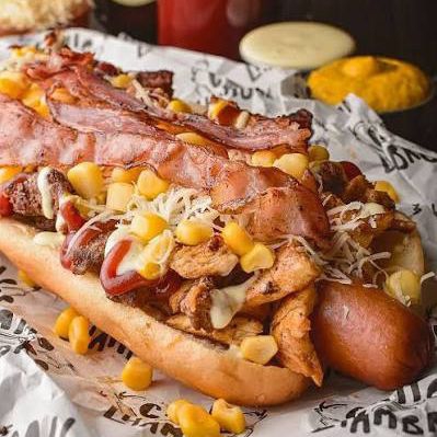 Pan súper, salchicha, lechuga, chongo, mozarella, salsas de la casa, carne, pollo salteado y tocineta