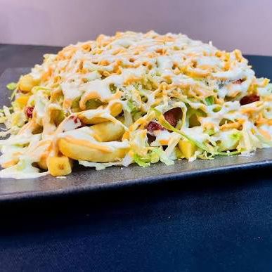 Papas francesas, lechuga, pollo, manguera, tártara, piña,queso,maiz, gratinado de mozzarella