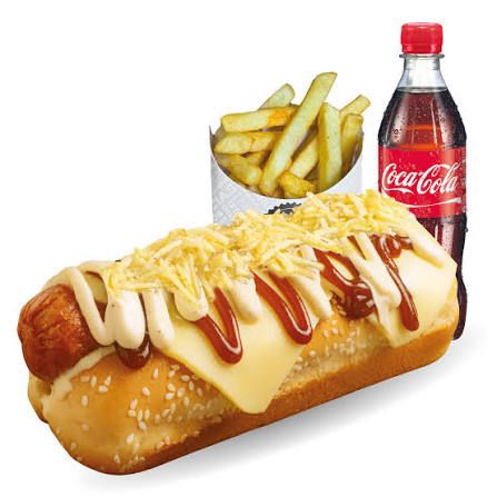 Pan super, salchicha, lechuga, chongo, queso, tártara, salsa de piña