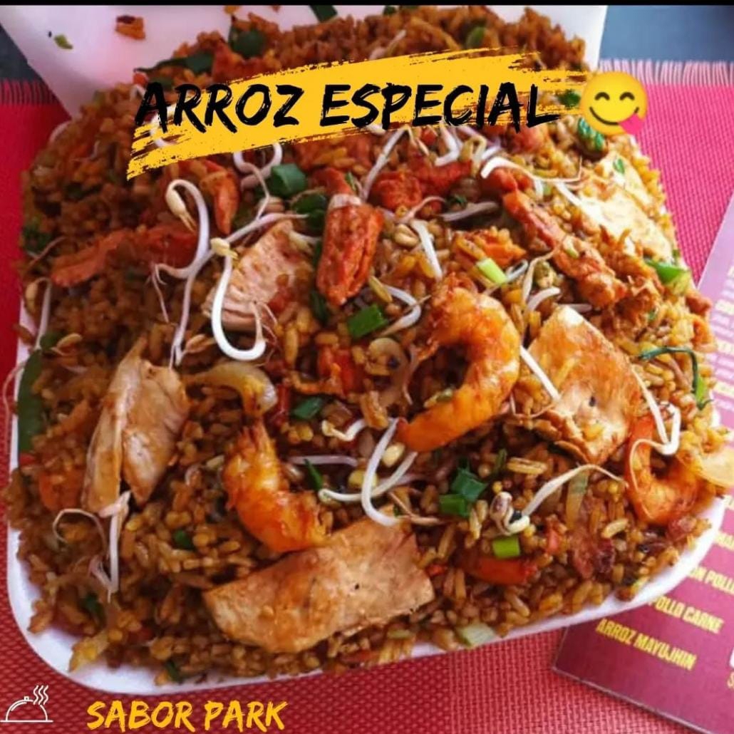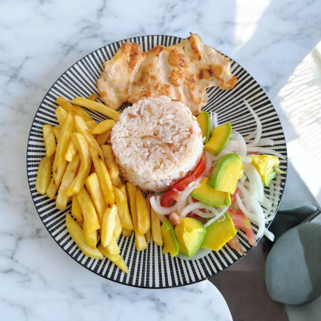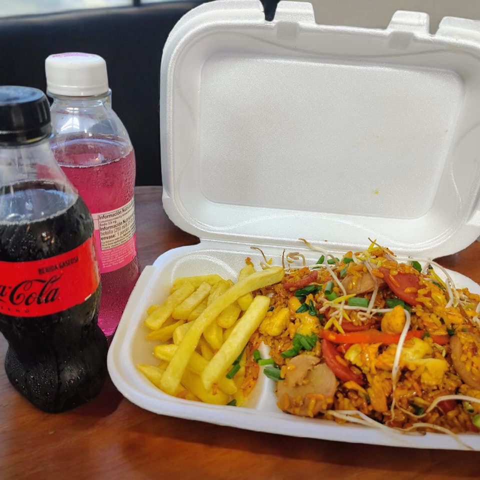 Arroz chino o blanco, ensalada papas o tajadas, proteína, y sopas