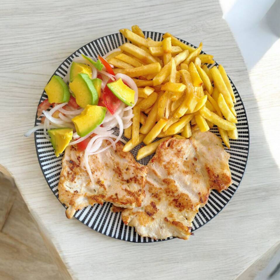 Pechuga, ensalada: lechuga, tomate, cebolla, papas a la francesa.