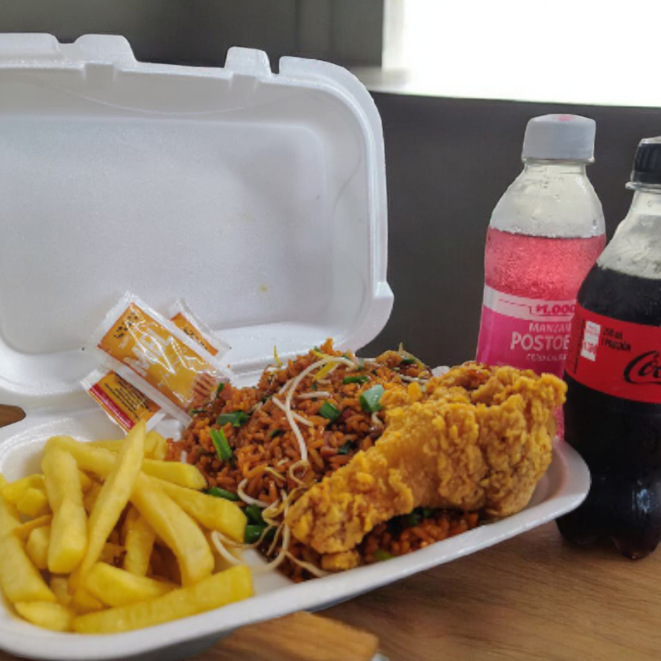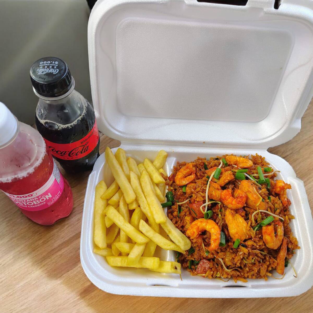Gaseosa Cocacola mini o manzana Postobón, porción de arroz costeño y papitas
