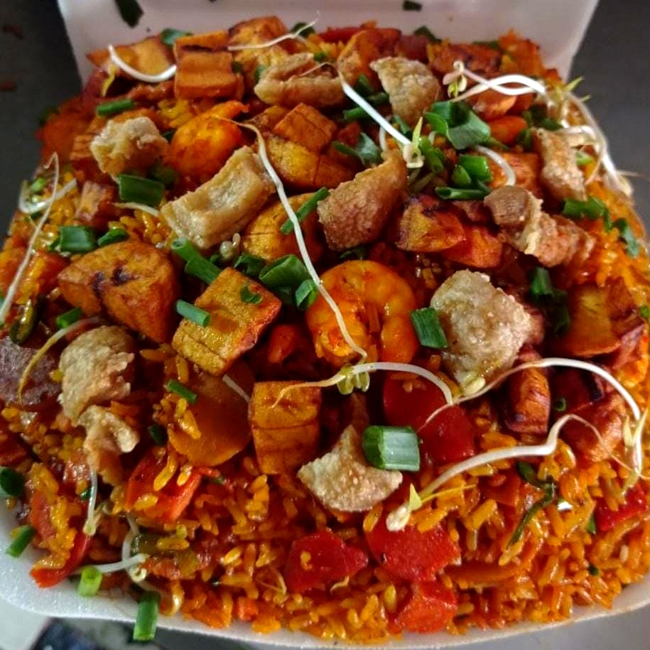 Cerdo, pollo, camarón, chorizo, butifarra, jamón y presa de pollo broaster.