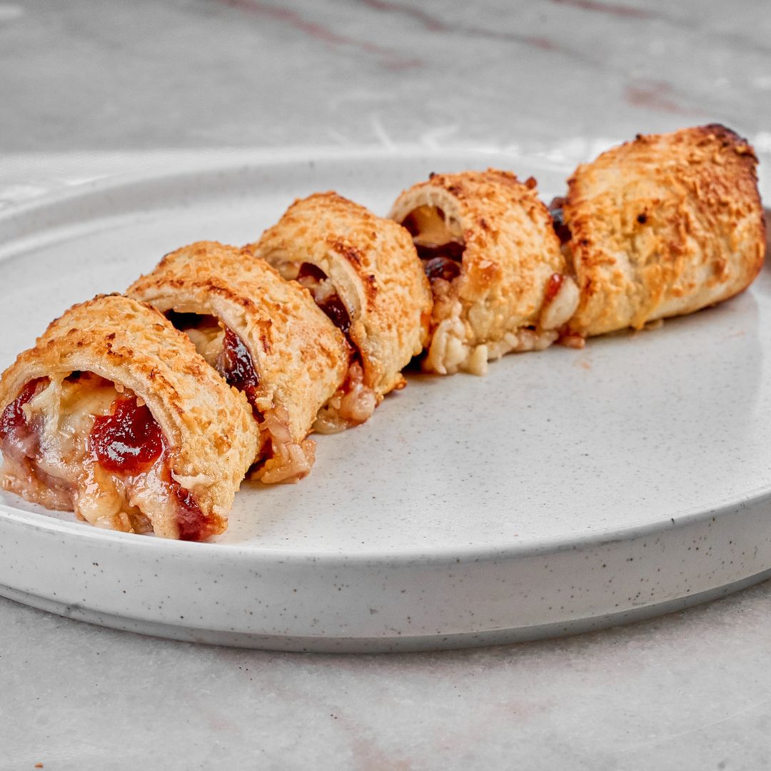 Rollo elaborado en nuestra masa de pizza, relleno de jamón, piña caramelizada, acompañado con salsa pomodoro.