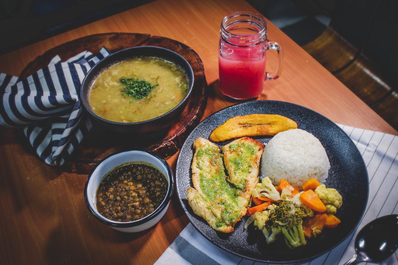 Pechuga asada, acompañada de arroz, ensalada (lechuga, tomate, cebolla), granos, tajada, sopa y jugo del día.