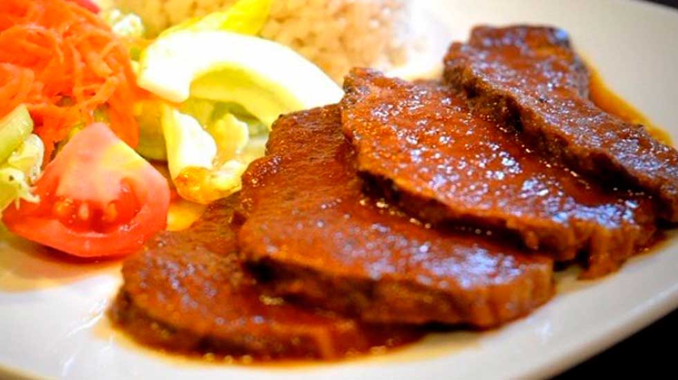 Carne en posta, acompañada de arroz, ensalada (lechuga, tomate, cebolla), granos, tajada, sopa y jugo del día.