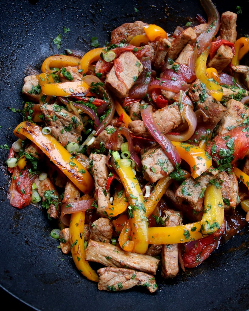 Fajitas de pollo, acompañadas de arroz, ensalada (lechuga, tomate, cebolla), granos, tajada, sopa y jugo del día.