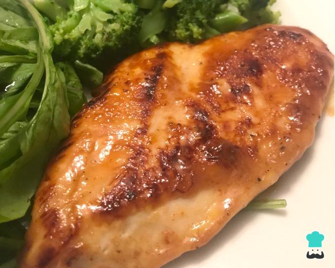 Pechuga salsa BBQ, acompañada de arroz, ensalada (lechuga, tomate, cebolla), granos, tajada, sopa y judo del día.