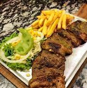 Churrasco 300 g, acompañado de papas a la francesa y ensalada (lechuga, tomate, cebolla).