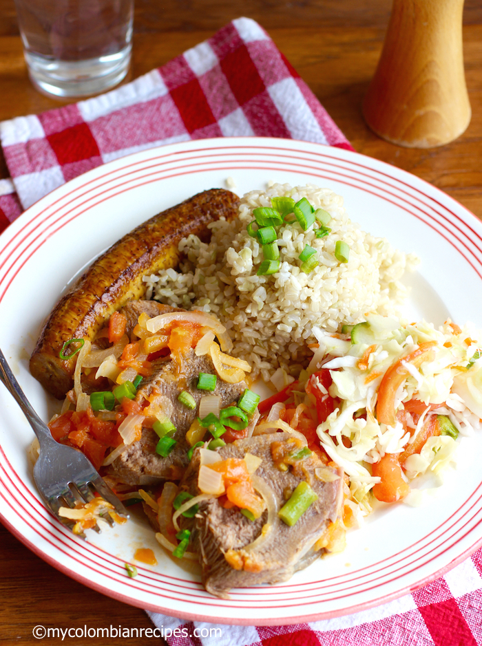 Lengua, acompañada de arroz, ensalada (lechuga, tomate, cebolla), granos, tajada, sopa y jugo del día.