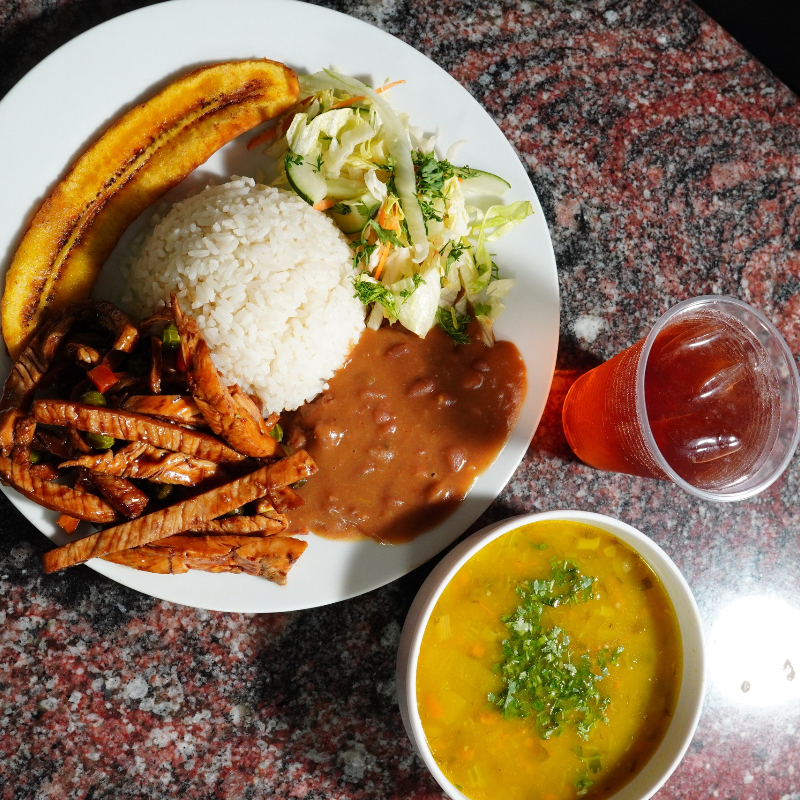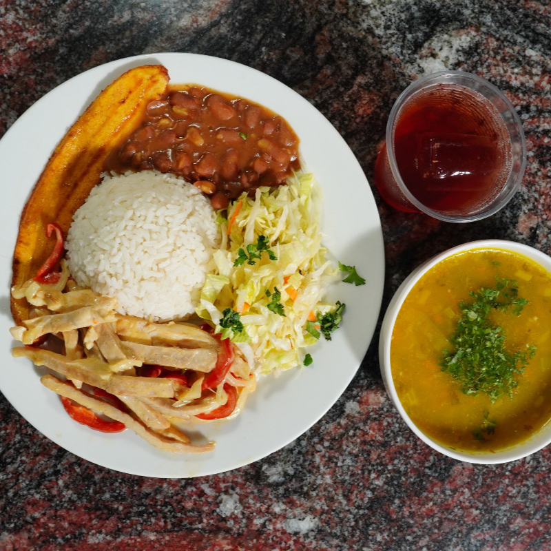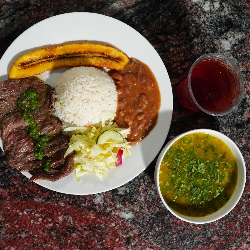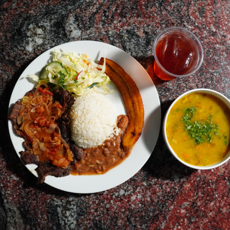 Carne en bistec, acompañada de arroz, ensalada (lechuga, tomate, cebolla), granos, tajada, sopa y jugo del día.