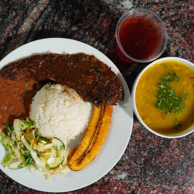 Carne en posta, acompañada de arroz, ensalada (lechuga, tomate, cebolla), granos, tajada, sopa y jugo del día.