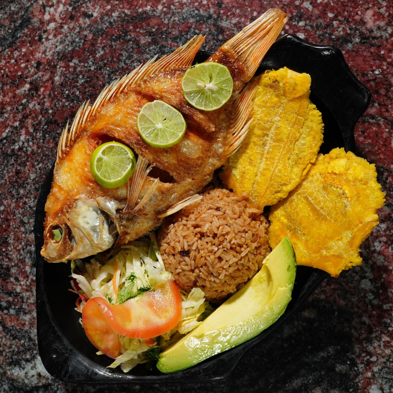 Mojarra frita, acompañada de arroz, ensalada (lechuga, tomate, cebolla). + sopa de pescado 9 Onz