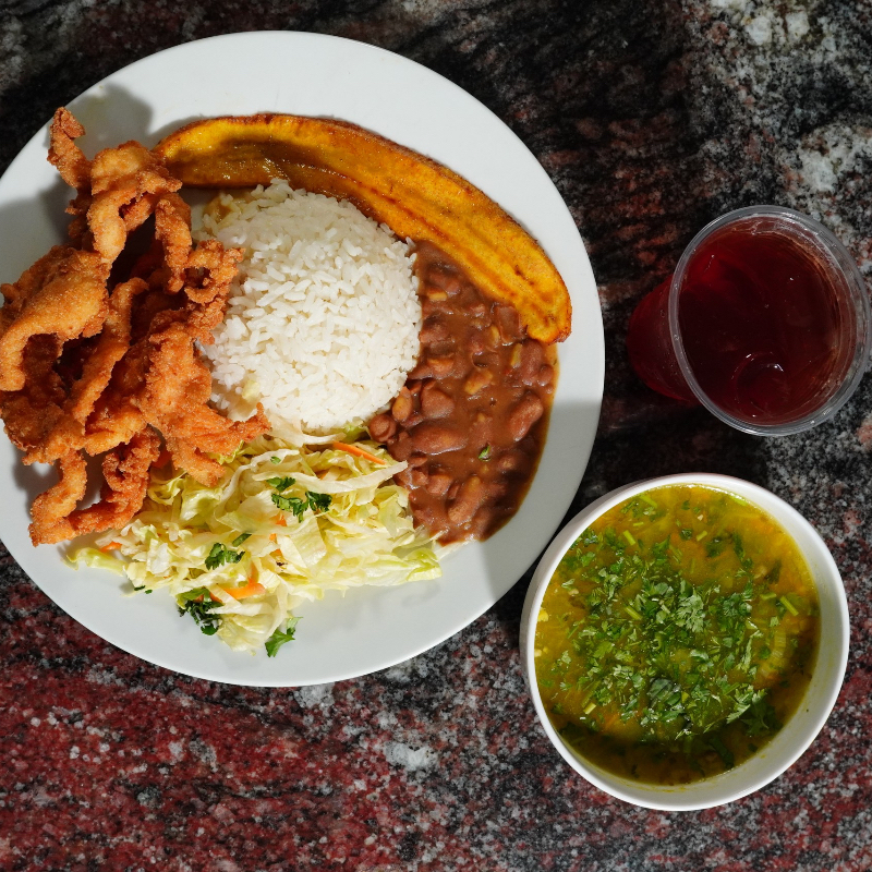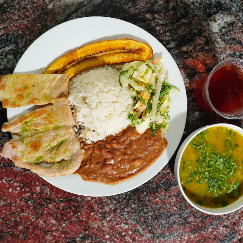 Pechuga de pollo y carne asada, acompañados de arroz, ensalada (lechuga, tomate, cebolla), granos, tajada, sopa y jugo del día.