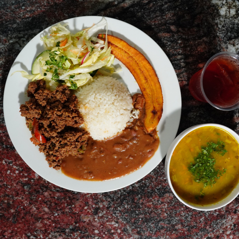 Carne molida, acompañada de arroz, ensalada (lechuga, tomate, cebolla), granos, tajada, sopa y juo del día.