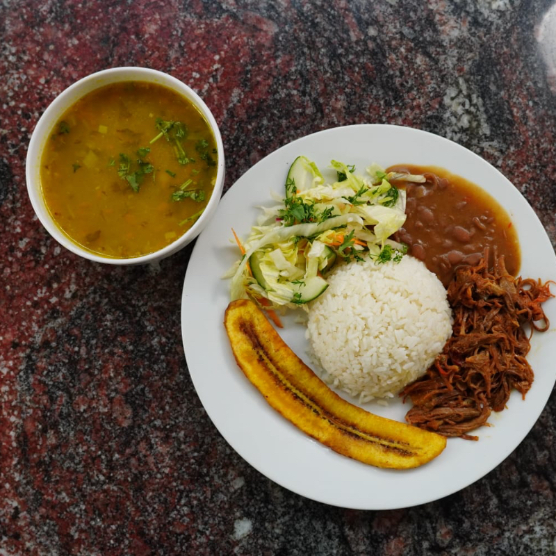 Carne desmechada, acompañada de arroz, ensalada (lechuga, tomate, cebolla), granos, tajada, sopa y jugo del día.