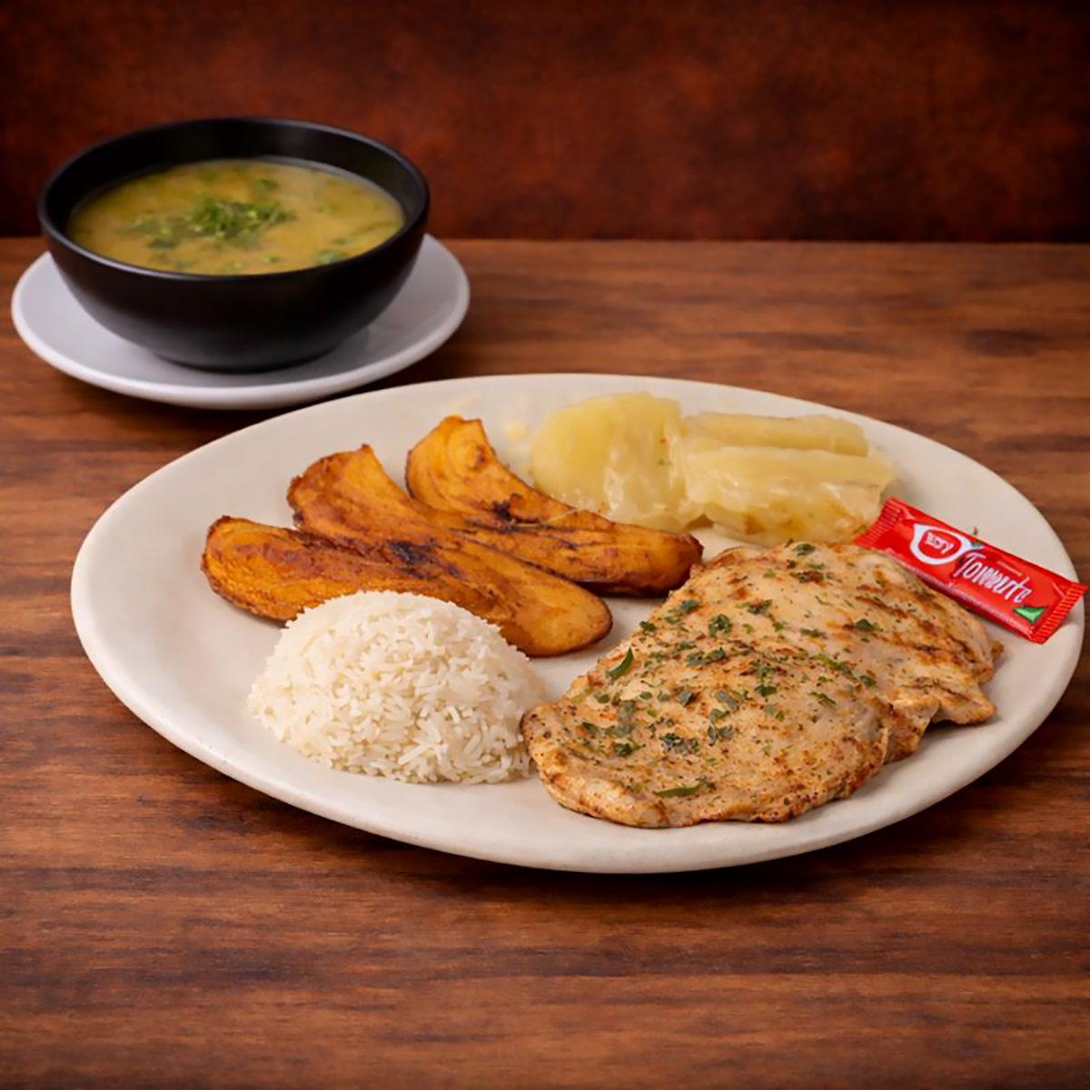 Acompañado de arroz blanco, patica de cerdo, chorizo, chicharrón, arepa y tajada.