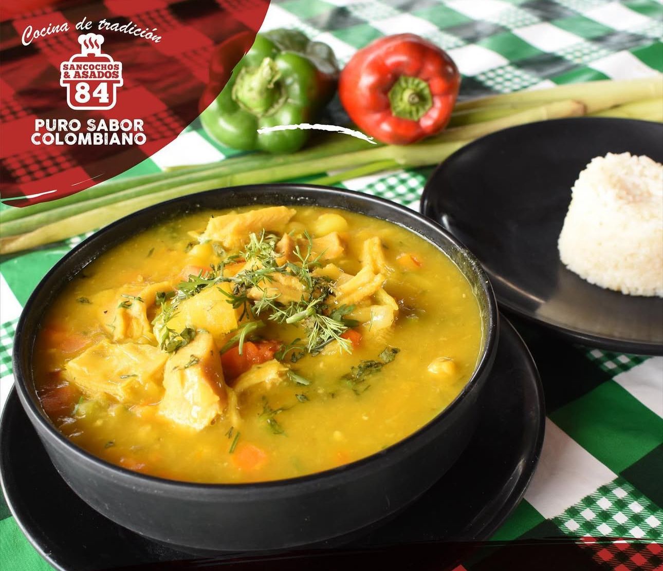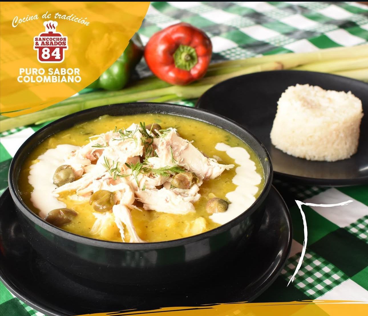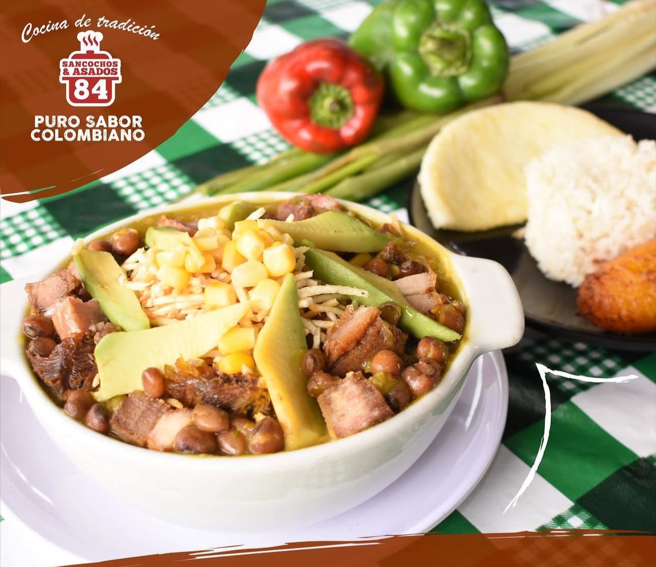 Acompañado de arroz blanco, patica de cerdo, chorizo, chicharrón, arepa y tajada.
