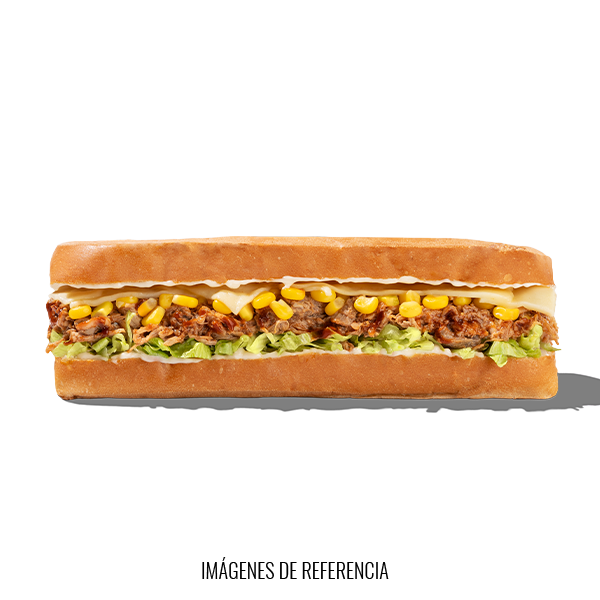 Con Más Carne De Res Desmechada, Queso Amarillo, Lechuga, Tomate, Pimentón, Apio, Mostaza, Salsa Bbq, Pasta De Tomate, Cebolla Roja Y Salsa Qbano