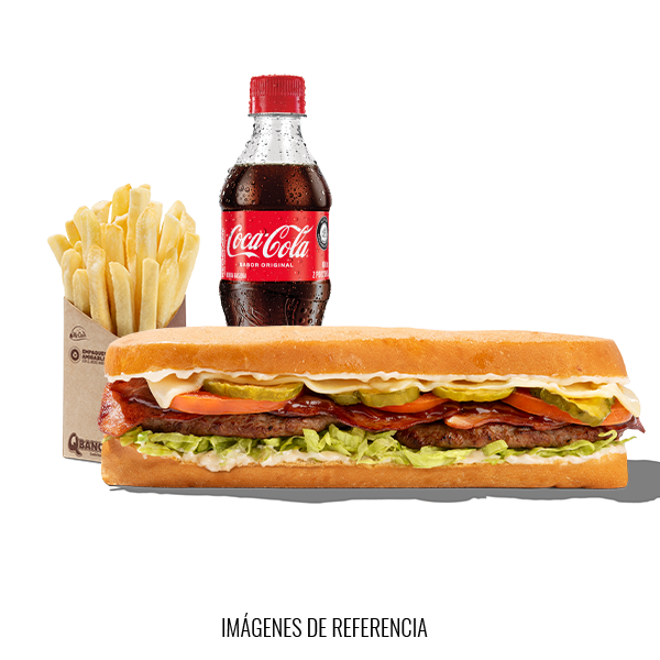 Roast Beef, tomate, queso mozzarella, lechuga, salsa BBQ y salsa Qbano, papas a la francesa y bebida.