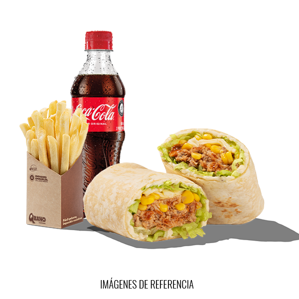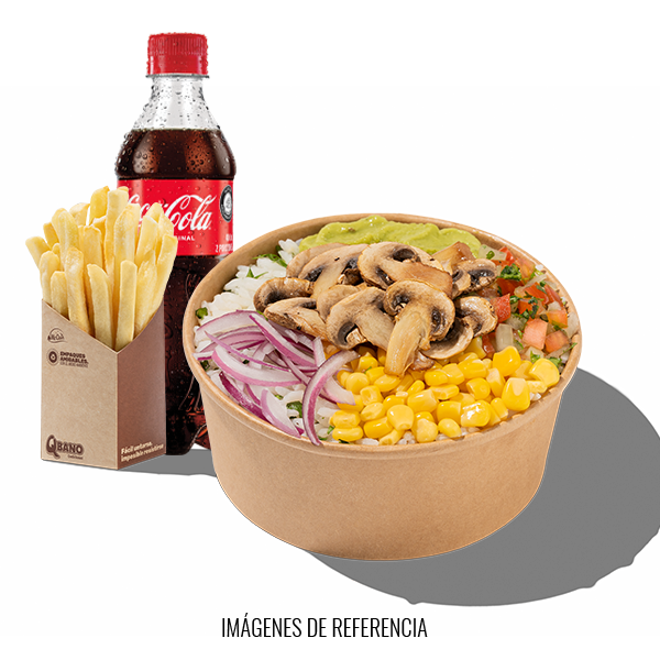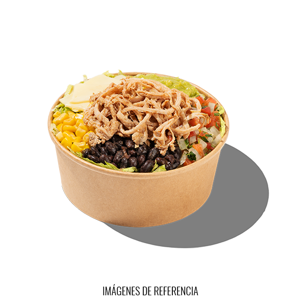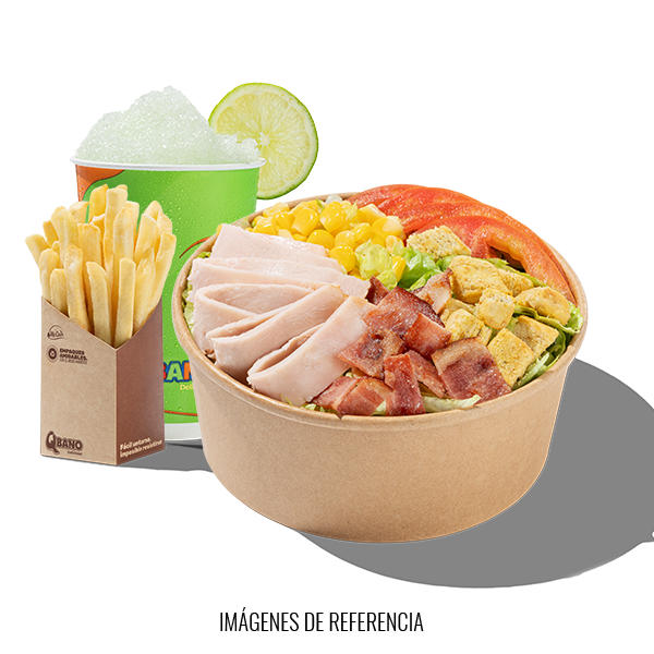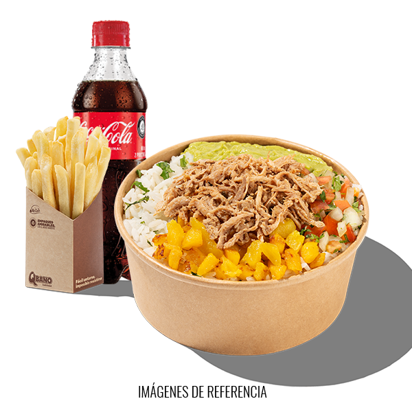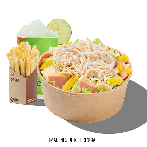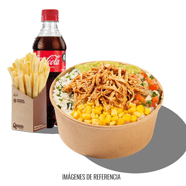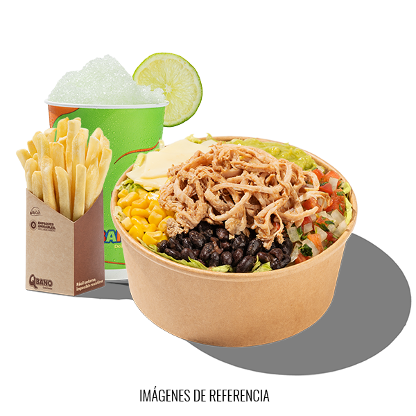 En Bowl Con Pechuga De Pollo Desmechada, Queso Costeño, Maíz, Mayonesa, Ripio De Papa, Lechuga Y Salsa Qbano En Combo Con Una Porción De Papas Pequeñas Y Una Gaseosa 250Ml