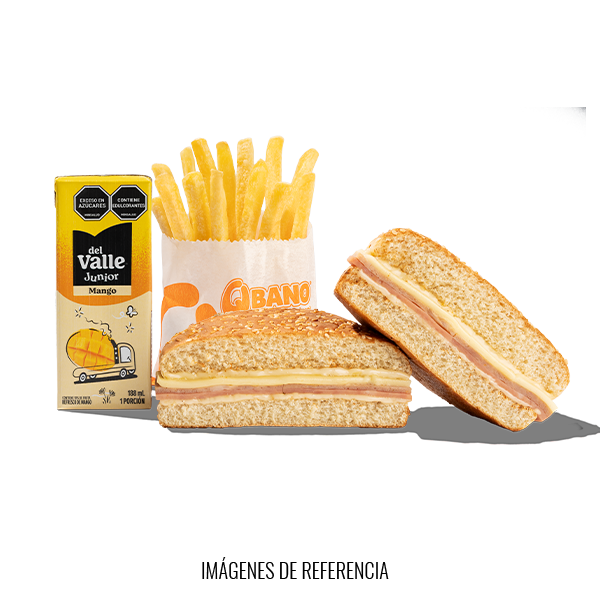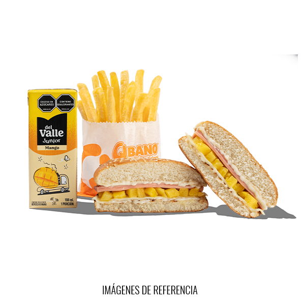 Un sándwich personal especial de 21cm aproximadamente, (1) un sándwich personal ropa vieja o pollo de 21cm aproximadamente (2) dos porciones de papas pequeñas, (2) dos limonadas 16oz o (2) dos gaseosas 250ml y (1) una porción de churros personal con arequipe