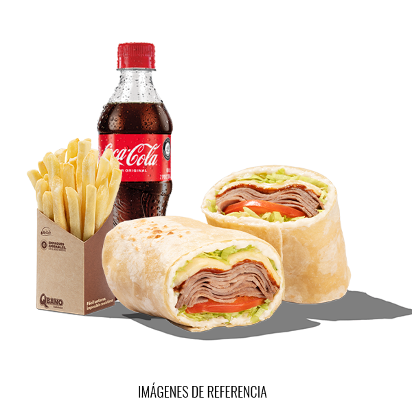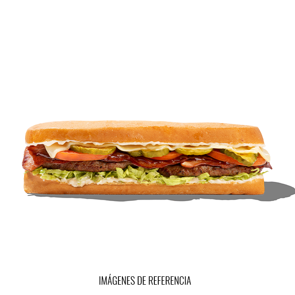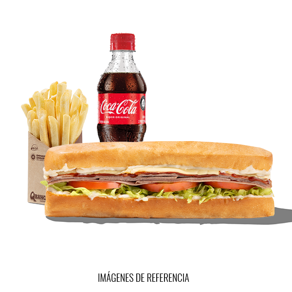 Roast Beef, tomate, queso mozzarella, lechuga, salsa BBQ y salsa Qbano, papas a la francesa y bebida.
