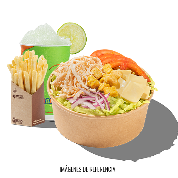 Pechuga pollo desmechado, lechuga Batavia, lechuga romana, salsa BBQ, tomate chonto, queso mozzarella, cebolla roja y croutones, papas y bebida.