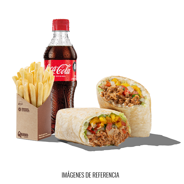 Costilla de cerdo, salsa BBQ, maíz tierno, queso mozzarella, lechuga y salsa Qbano, papas a la francesa y bebida.