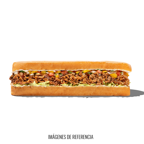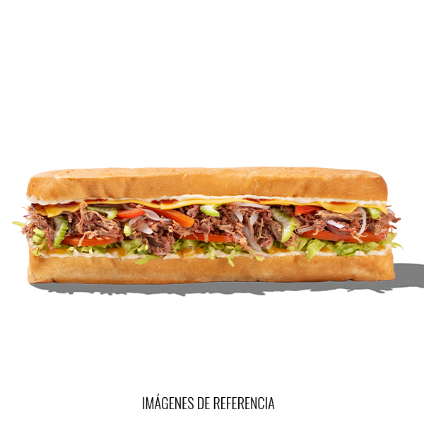 Con Más Carne De Res Desmechada, Queso Amarillo, Lechuga, Tomate, Pimentón, Apio, Mostaza, Salsa Bbq, Pasta De Tomate, Cebolla Roja Y Salsa Qbano