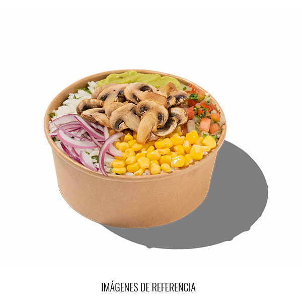 Arroz con cilantro, guacamole, pico de gallo (cebolla blanca, tomate y cilantro), maíz tierno, cebolla roja y champiñones.