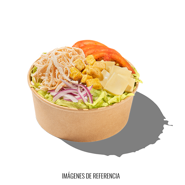 Pechuga pollo desmechado, lechuga Batavia, lechuga romana, salsa BBQ, tomate chonto, queso mozzarella, cebolla roja y croutones.