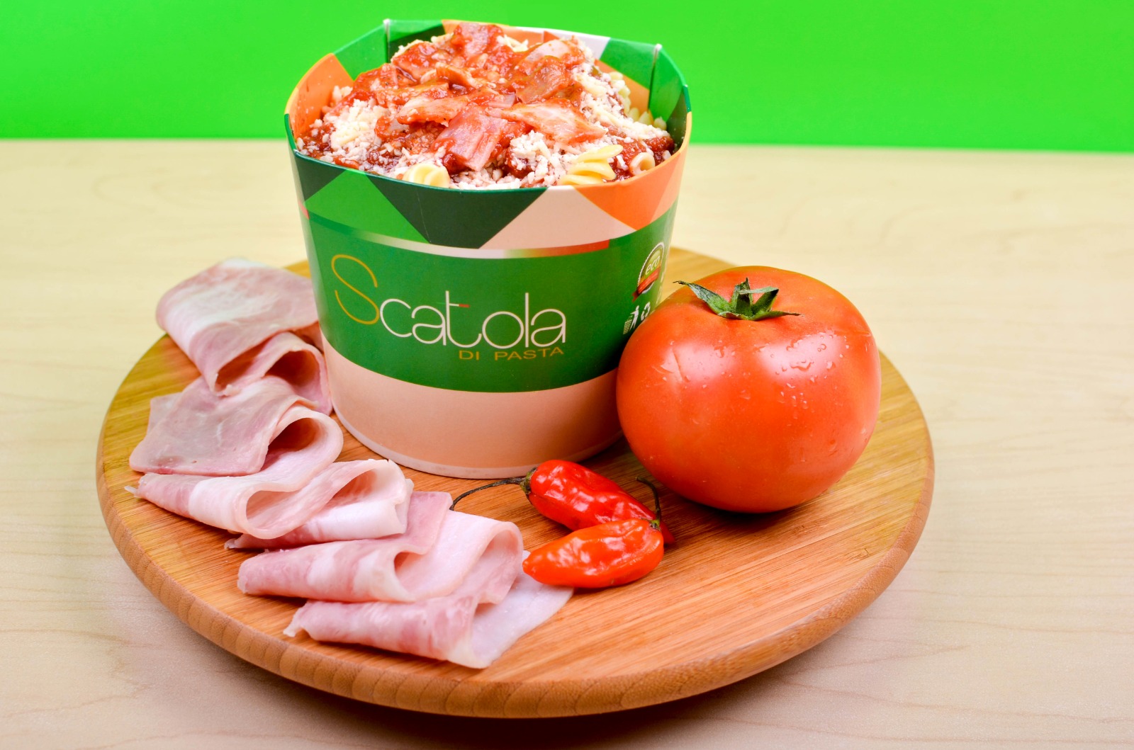 Pasta con tocineta, tomate, cebolla, picante, pan y queso parmesano.