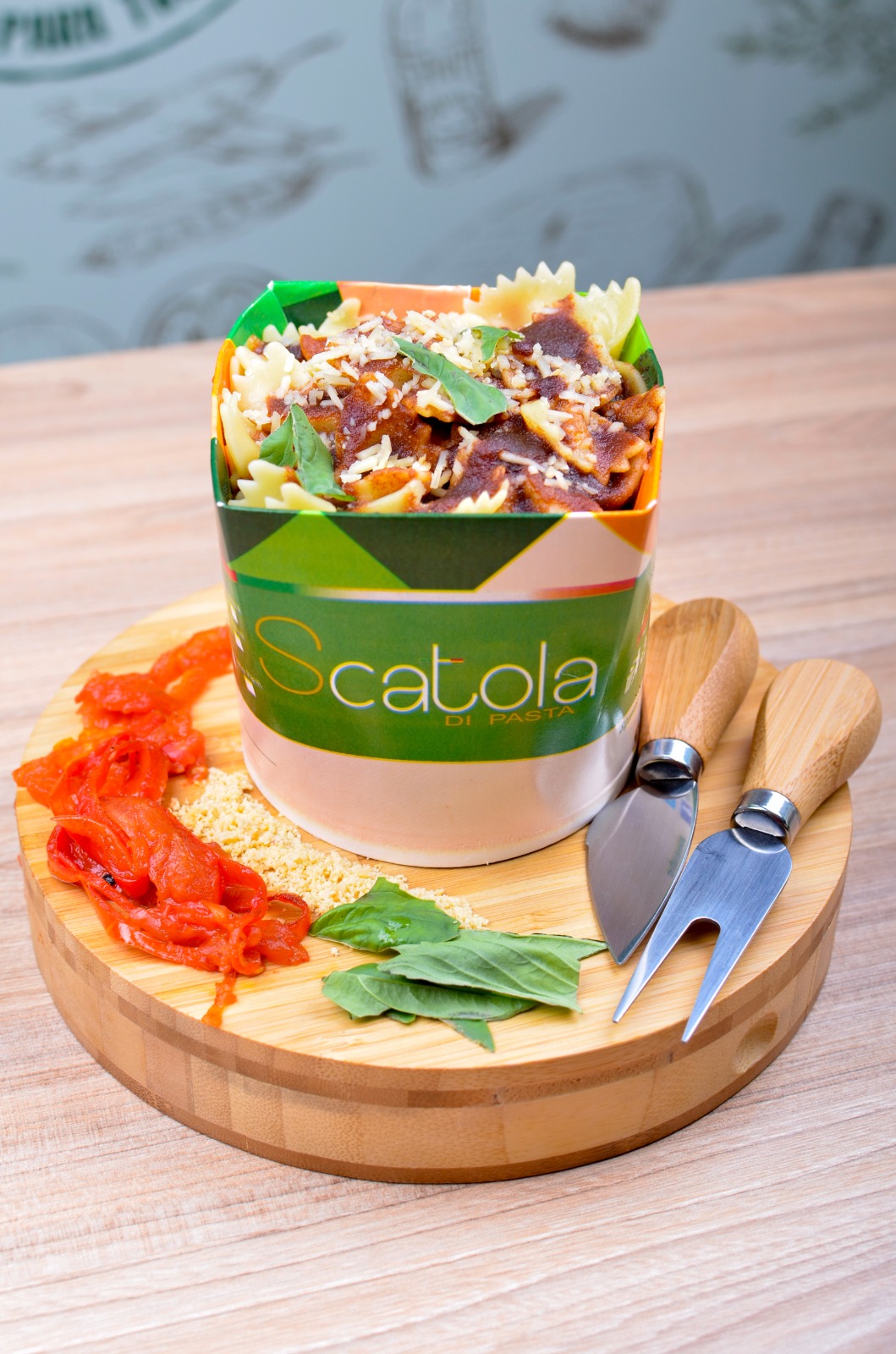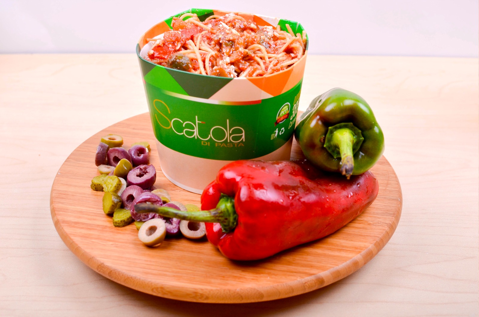 Pasta con pimentones, aceitunas, pepinillos y cebolla, aceite de oliva o salsa napolitana con pan y parmesano.