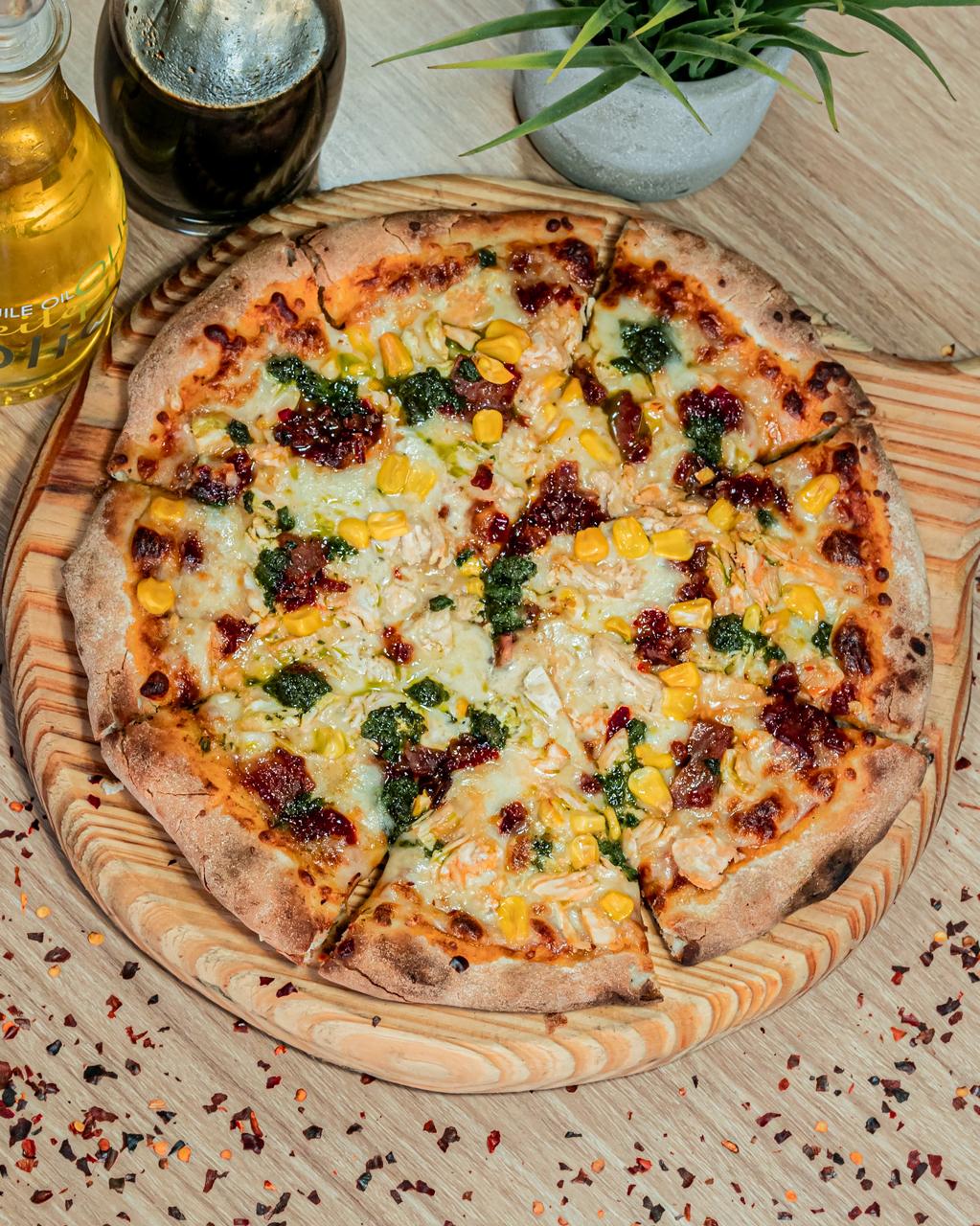 Participante del pizza máster 2024 . Pizza (32cm 8 porciones) Salsa napolitana y bechamel, pollo desmechado, tocineta en reducción sweet chili, queso mozarella, pesto y maíz