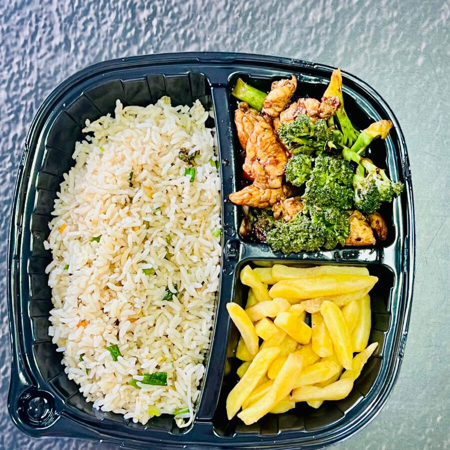 ARROZ ORIENTAL, POLLO CON BRÓCOLI, PAPAS A LA FRANCESA + BEBIDA 400ML