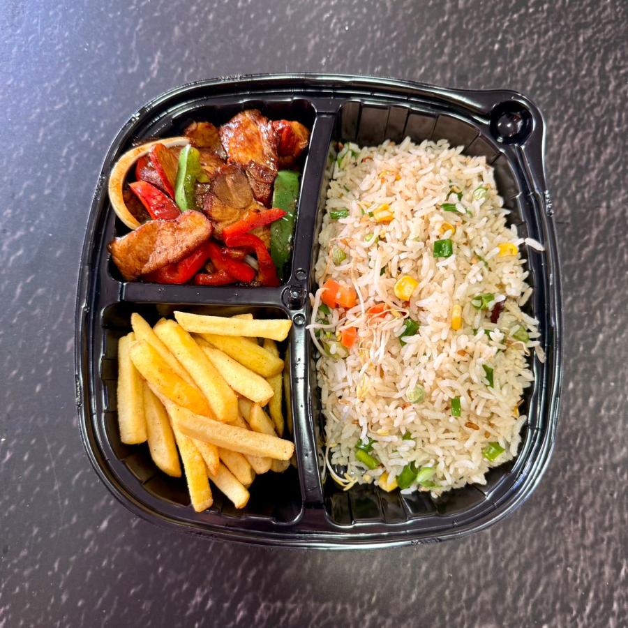 Arroz con lomito, pollo, 2 porciones de papas a la francesa, kola roman 1,5 lts