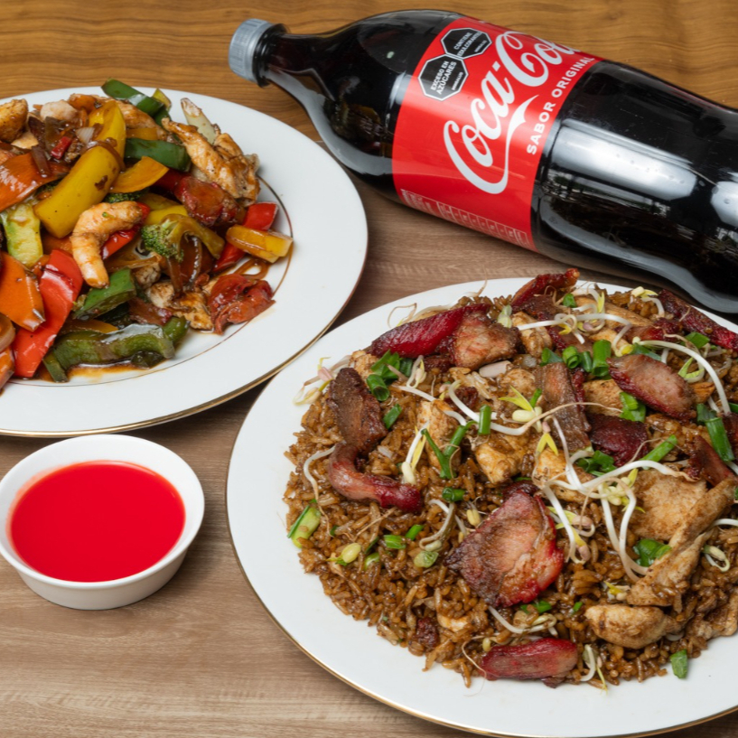 Arroz chino de lomito familiar, lo mein especial Shangai medio y CocaCola 1.5 LTS.