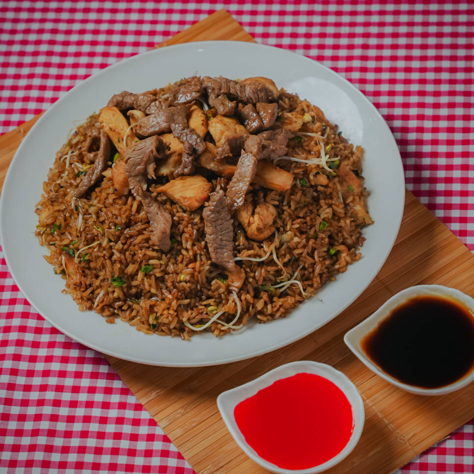 Porción familiar (3-4 personas) incluye 1500 Grs de Arroz frito al wok con trozos de pollo, cerdo, camarones, jamón especial, raíces chinas, cebollín, salsa a eleccion.