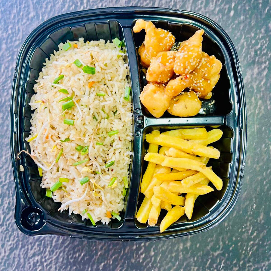 ARROZ ORIENTAL + POLLO CON AJONJOLÍ + PAPAS A LA FRANCESA