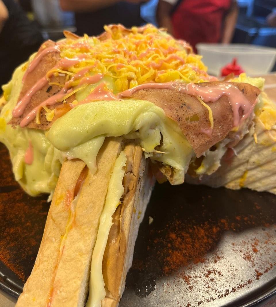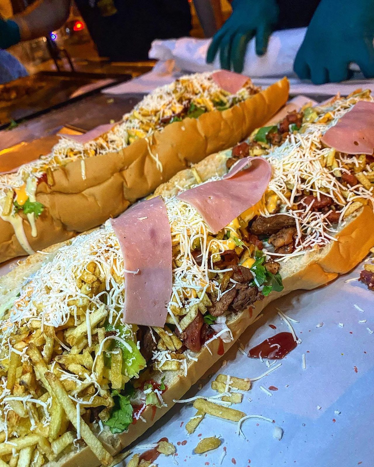 2 DELICIOSOS PANES BAGUETTE BLANDO, RELLENO DE LOMO CERDO, PECHUGA DE POLLO SALTEADA CON PIMENTON Y CEBOLLA GRILLE, TOCINETA,MAIZ, CHONGO QUESO MOZARELLA Y NUESTRA DELICIOSS SALSA BULL