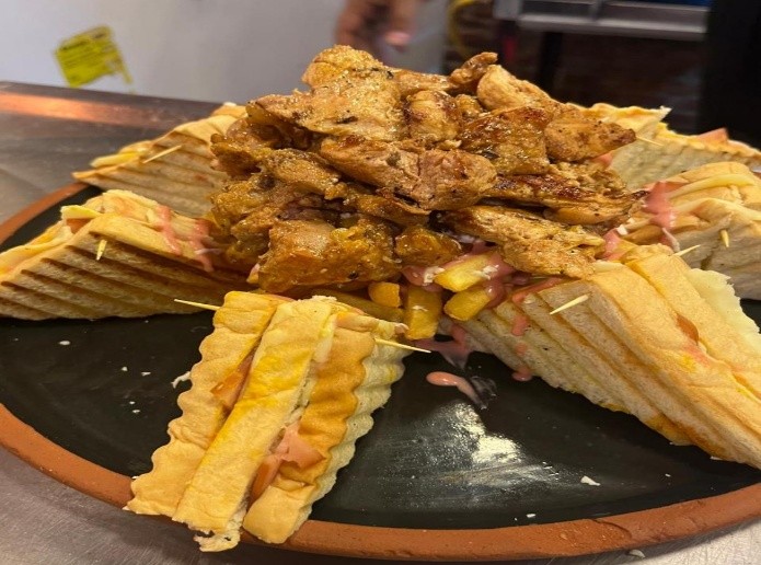 DELICIOSOS PANES TRIANGULARES CRUJIENTES, BAÑADOS EN NUESTRA DELICIOSA SALSA TARTARA Y DE TOMATE, ACOMPAÑADO DE LECHUGA, TOMATE JAMON PREMIUN Y QUESO AMERICANO, Y UN MIX DE PAPAS FRANCESAS, SALTEADOS EN POLLO Y CERDO GRILLE CON TROZOS DE TOCINETA CROCANTE Y QUESO COSTEÑO RAYADO